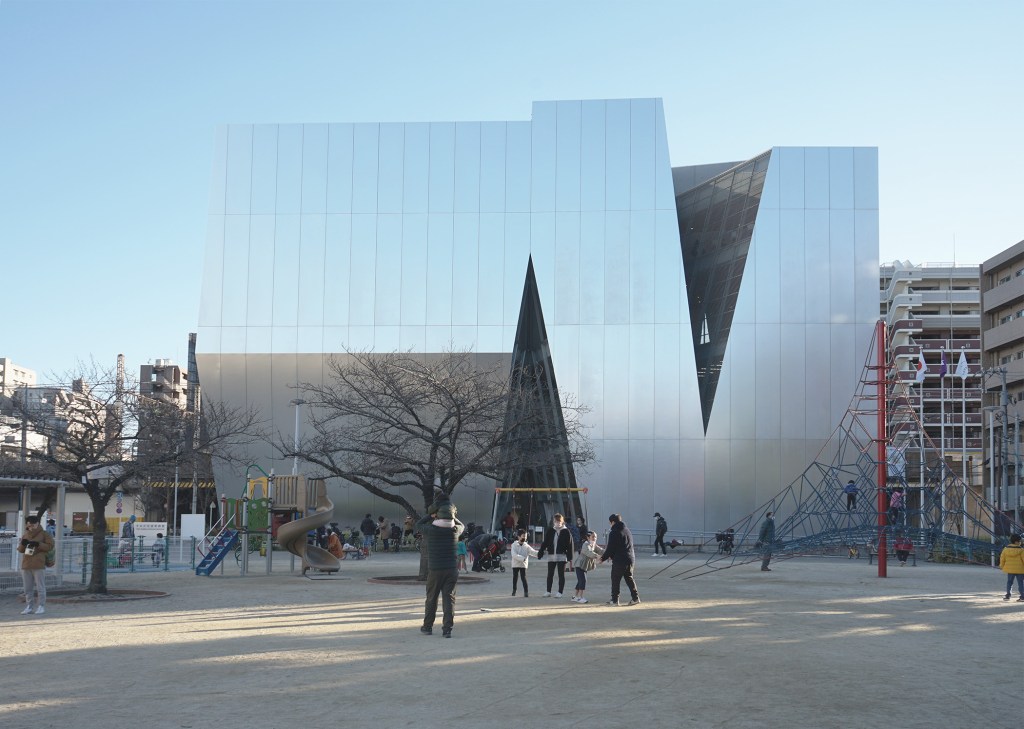 此時在於後方浮現的物體,幾乎與天空毫無區別,卻以強烈人工的表面與清晰劃分的線條,像是在展示著隱身的破綻,捲起些許皺摺。這個佇立在公園情景後方的混沌形體,是由SANAA 所設計的「墨田北齋美術館」。是裝著一壺流動天空的背景垂暮。